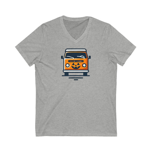 Halloween Pumpkin Camper Van V-Neck Tee - Unisex Jersey Short Sleeve T-Shirt
