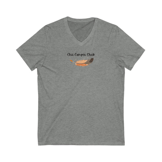 Chic Camper Chick Colorful Feathers V-Neck Tee - Perfect for Outdoor Adventures