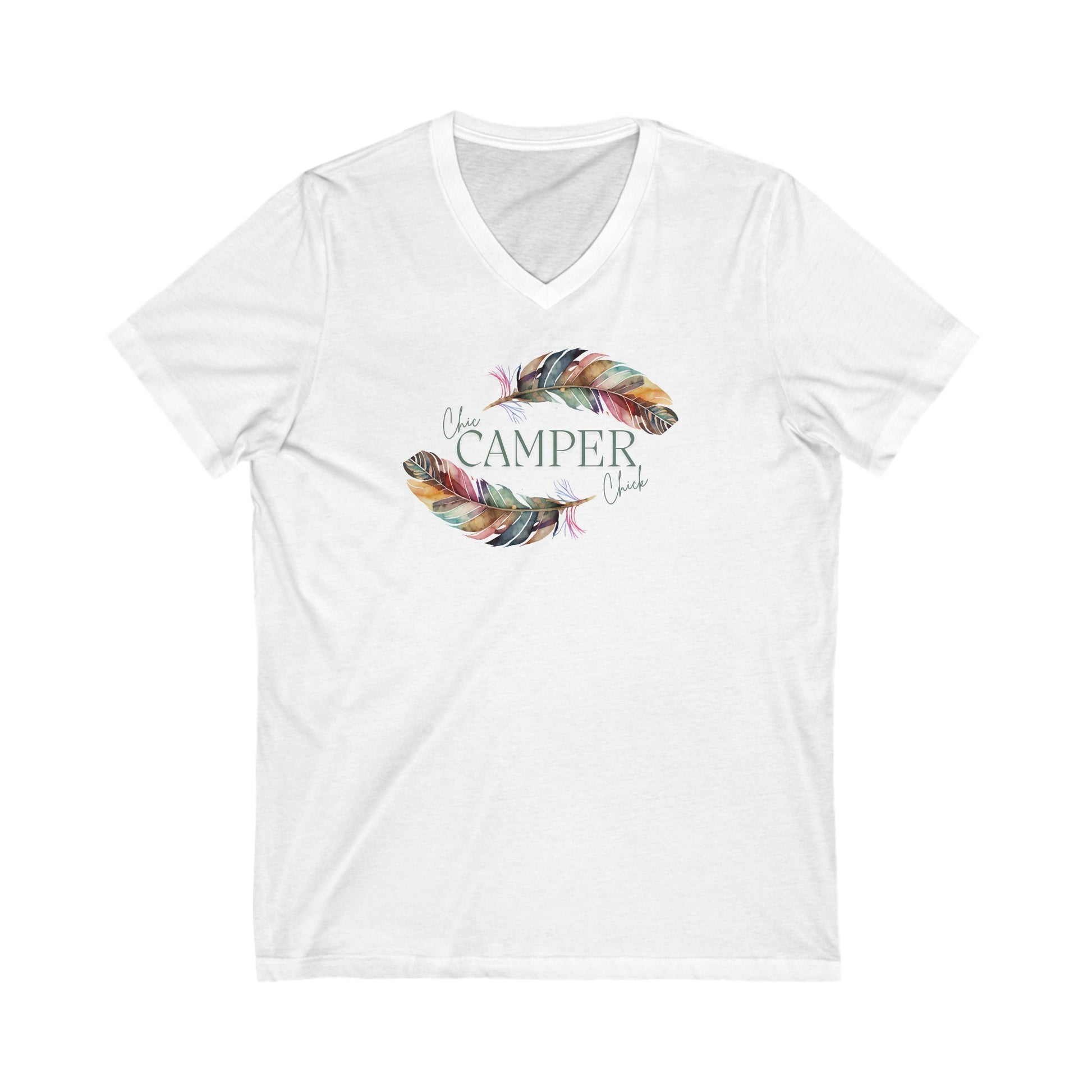 Chic Camper Chick Colorful Feathers V-Neck Tee - Perfect for Outdoor Adventures