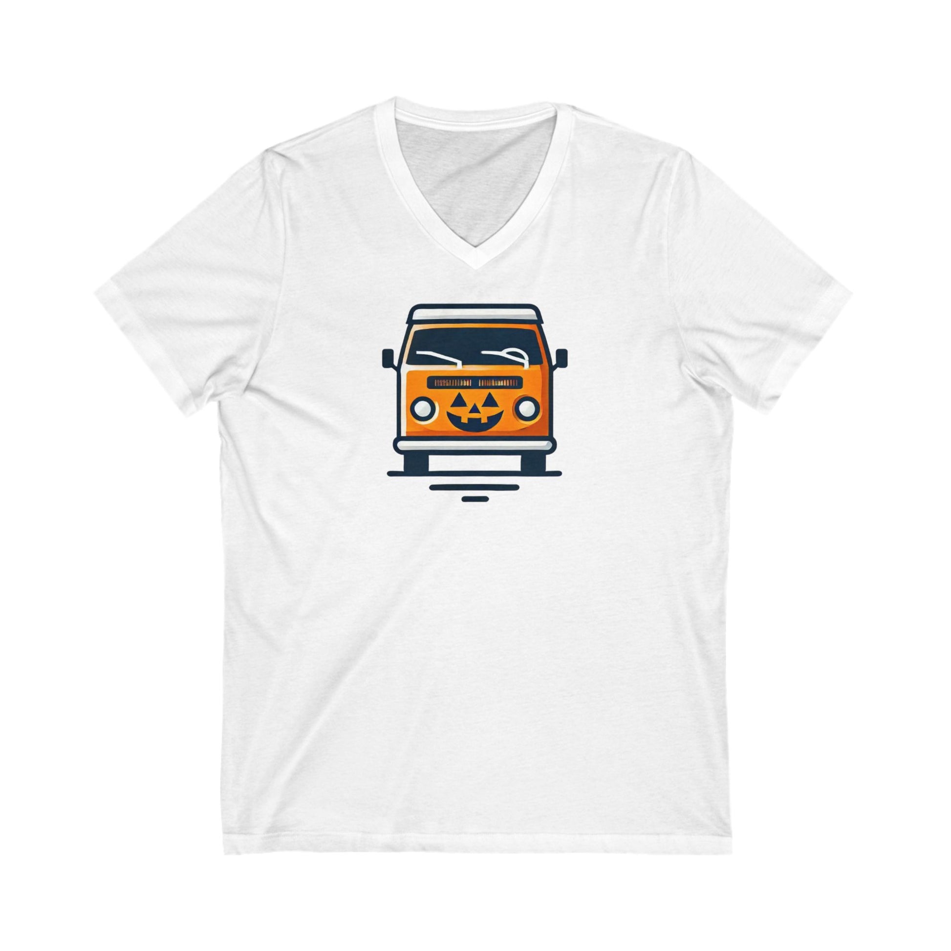 Halloween Pumpkin Camper Van V-Neck Tee - Unisex Jersey Short Sleeve T-Shirt