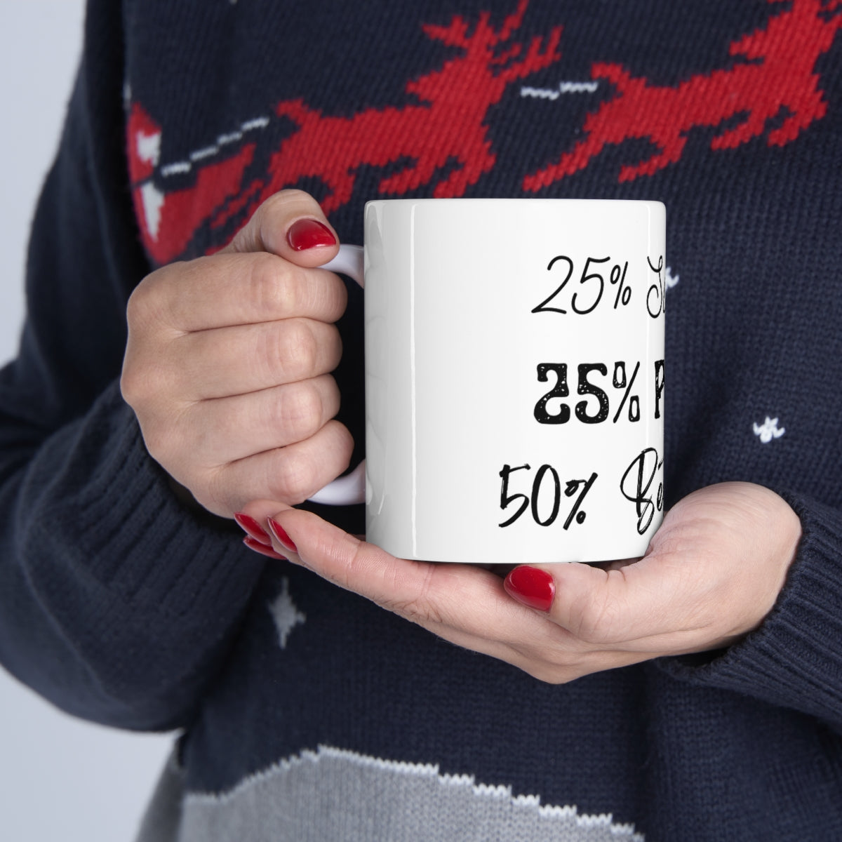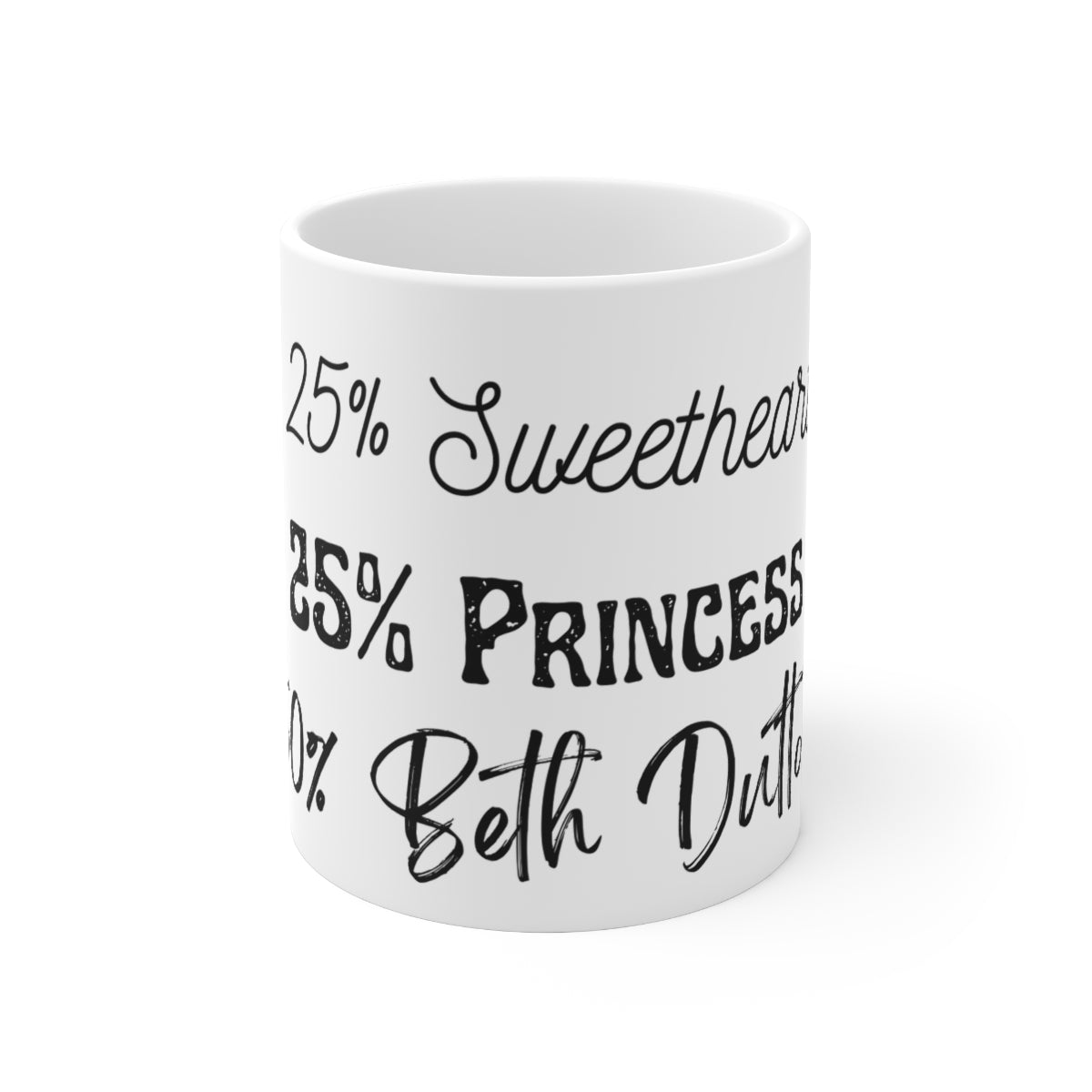 Yellowstone lovers! 25% Sweetheart, 25% Princess, 50% Beth Dutton . Warm-up with a nice cuppa out of this customized ceramic coffee mug. . It’s BPA and Lead-free, microwave & dishwasher-safe, and made of white, durable ceramic in an 11-ounce size. The perfect gift for coffee, tea, and chocolate lovers.